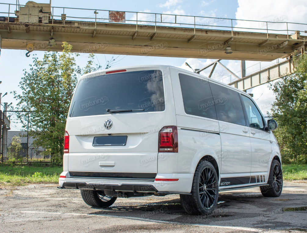 Диффузор заднего бампера на Фольксваген Т6.1 Каравелла 2020, 2021, 2022, 2023, 2024, 2025 г. является дополнительным тюнингом вашему автомобилю. Придаёт авто более брутальный и спортивный вид. Диффузор выполнен из высококачественного АВС-пластика. Также служит отличной защитой от веток, камней и столкновения с бордюром при парковке.